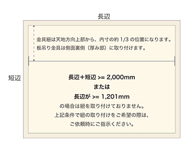 基本的に天地方向上部から1/3程度の位置に金具と紐を取り付けておりますが、